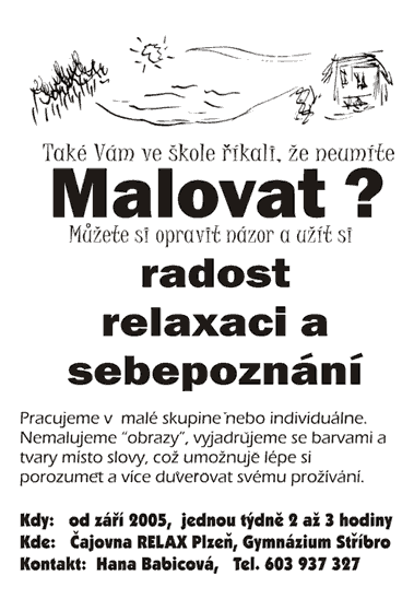 Můžete to zkusit. Od září 2005 připravuji malování v malé skupině (maximálně 10 lidí), které bude zaměřeno na relaxaci, radost z vlastní tvorby a sebepoznání v bezpečném a příjemném prostředí podobně naladěných lidí.